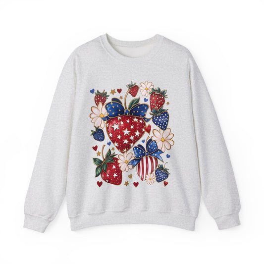 Patriotic Strawberry Sweatshirt, Cozy Crewneck for Casual Wear, Cute Gift for Her, Summer Picnic, 4th of July Style, Comfortable Fashion