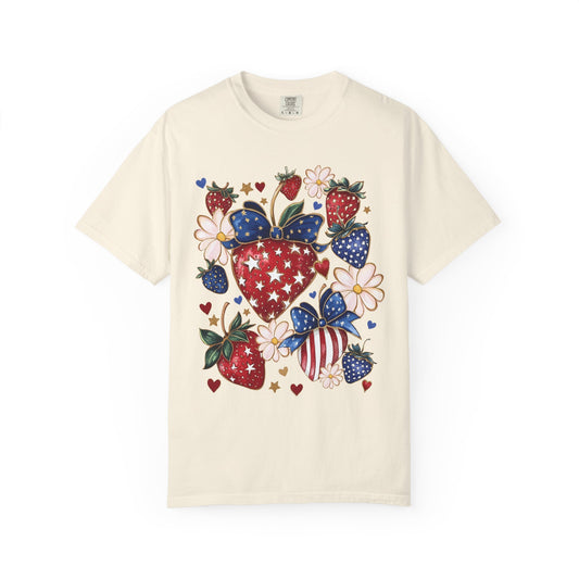 Boho 4th of July Strawberry, Patriotic Coquette Graphic Tee