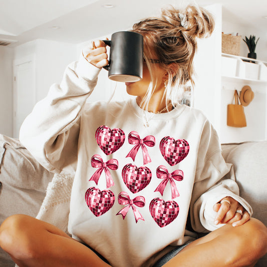 Pink Coquette and Heart Disco Ball Valentine Graphic Crewneck Sweatshirt
